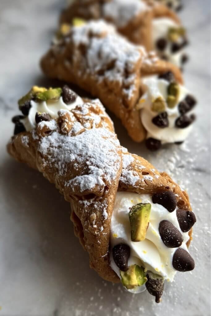 Combine well-drained ricotta, mascarpone, powdered sugar, vanilla, and cinnamon. Beat until smooth, then fold in mini chocolate chips and optional candied orange peel.