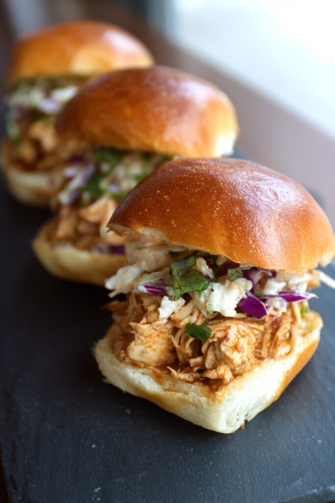 Primary components: Cooked shredded chicken (rotisserie chicken works great!), soft slider buns, and a creamy coleslaw for crunch.